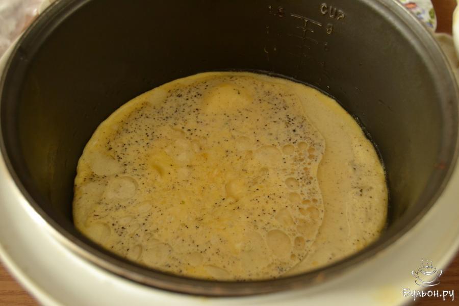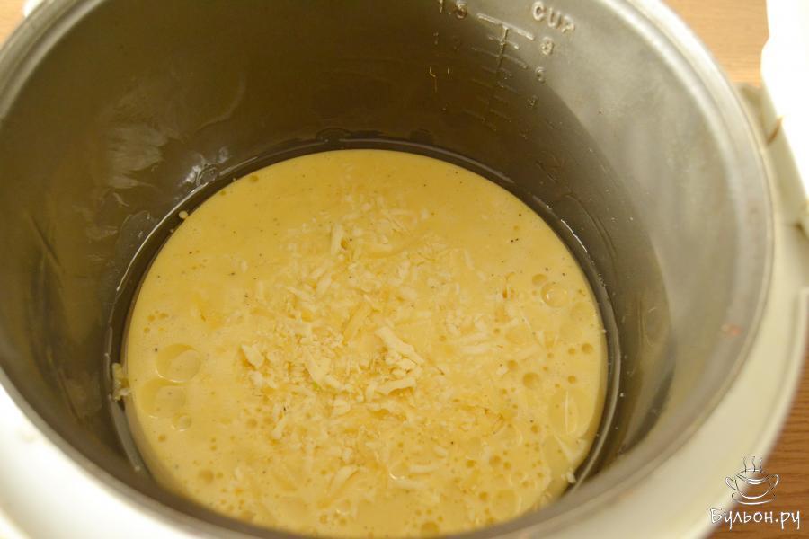 5. Чашу мультиварки смазать подсолнечным маслом. Залить яично-молочную массу, добавить тертый сыр. Готовить омлет на программе "Пароварка" (115-120 градусов) или другой, при которой температура готовки выше 100 градусов.