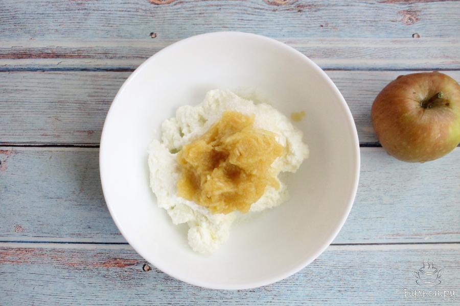 6. Яблоки промыть, убрать семечки и перетереть яблоки через мелкую терку. Немного отжать с яблочной массы сок и добавить яблоки к творогу. Перемешать.