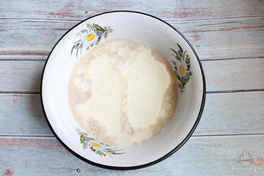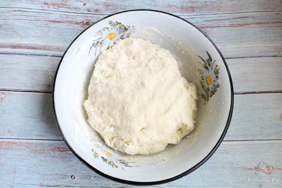 4. Добавить в молочную смесь муку и замесить мягкое тесто. Накрыть чашку с тестом и убрать в теплое место на час.