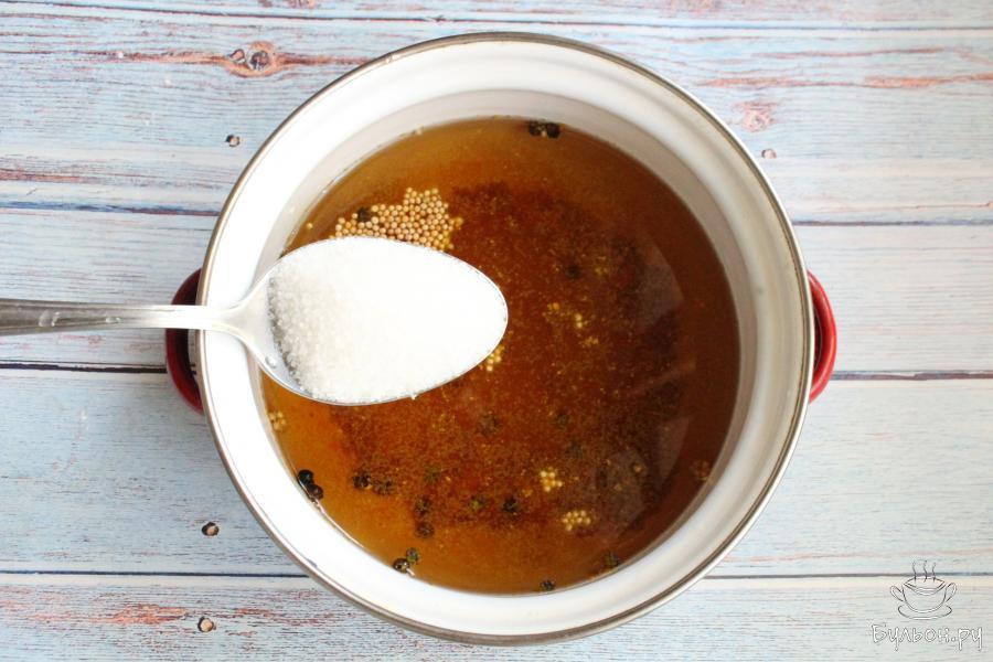 7. Добавить в уксус сахар. Количество сахара можно увеличить до двух стаканов, это по вкусу. Довести маринад до кипения, помешивать, чтобы сахар растворился.