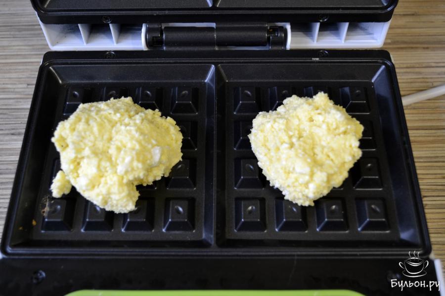 6. Разогреть вафельницу, если нужно, то немного смазать панели растительным маслом и выложить тесто в вафельницу, из расчета - по полной столовой ложке на одну вафлю.