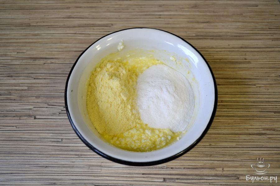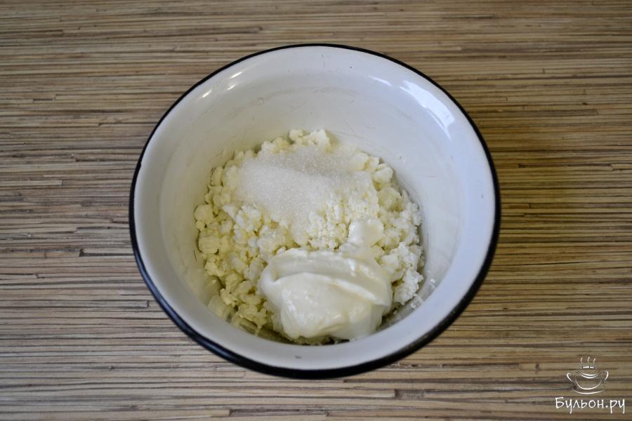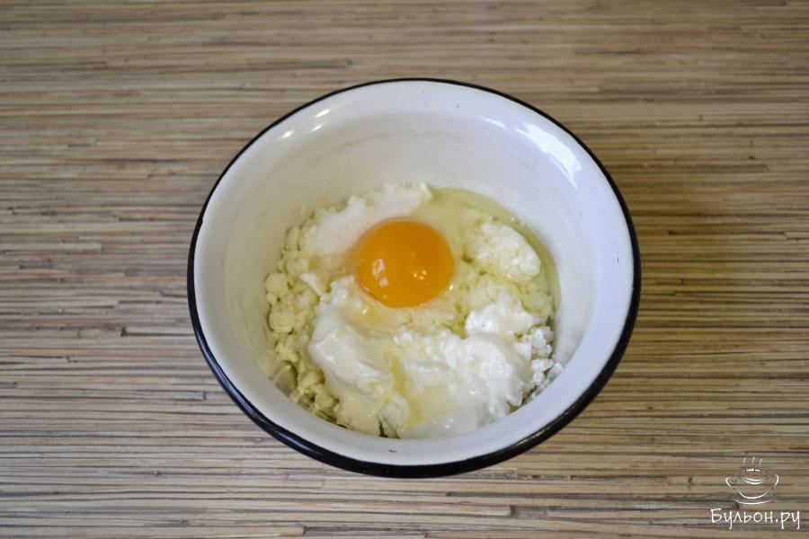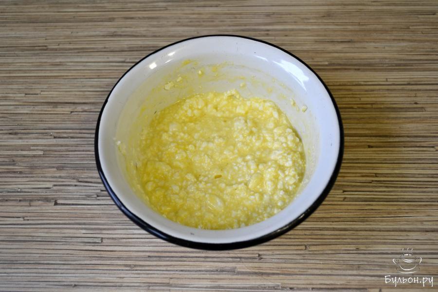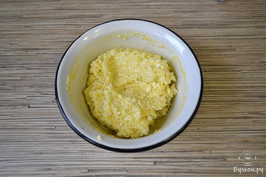 5. Перемешать творожную массу с мукой. Тесто будет довольно густое, как для обычных сырников. Муки может понадобится немного другое количество, оно зависит от влажности творога. Если тесто получается жидкое, добавляйте по чуть-чуть муки и перемешивайте.