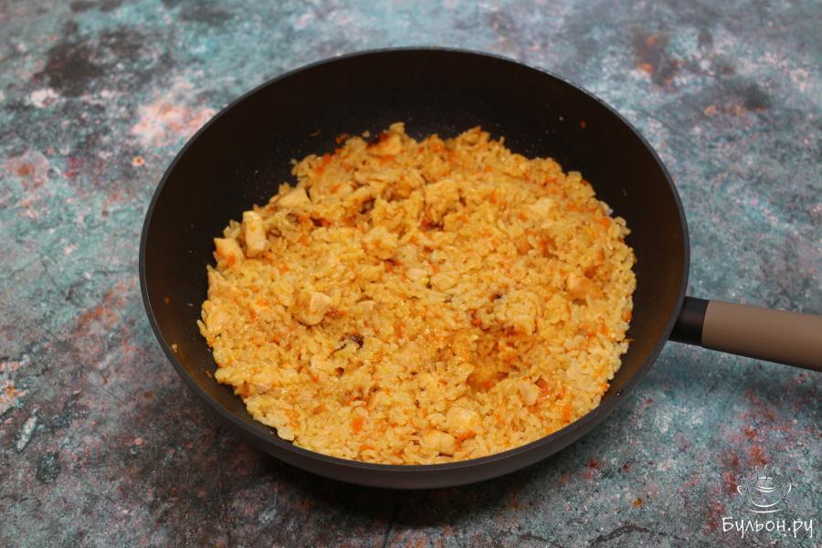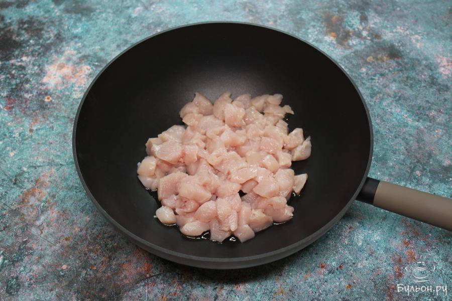 1. Куриное филе нарезать на кубики и отправить на сковородку с небольшим количеством растительным маслом. Потушить филе примерно 30 минут, после чего добавить еще немного масла и немного прожарить. Но курица должна все равно остаться светлой.