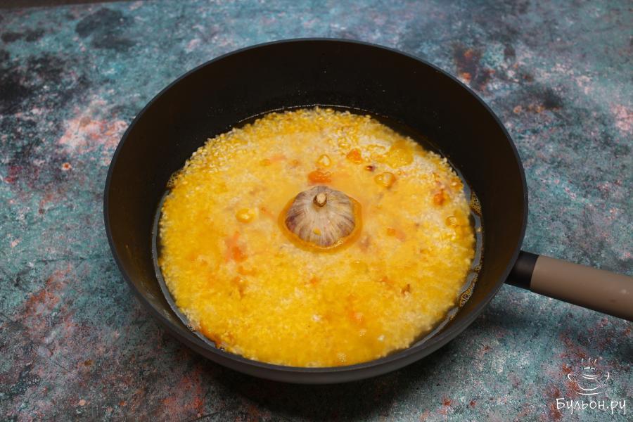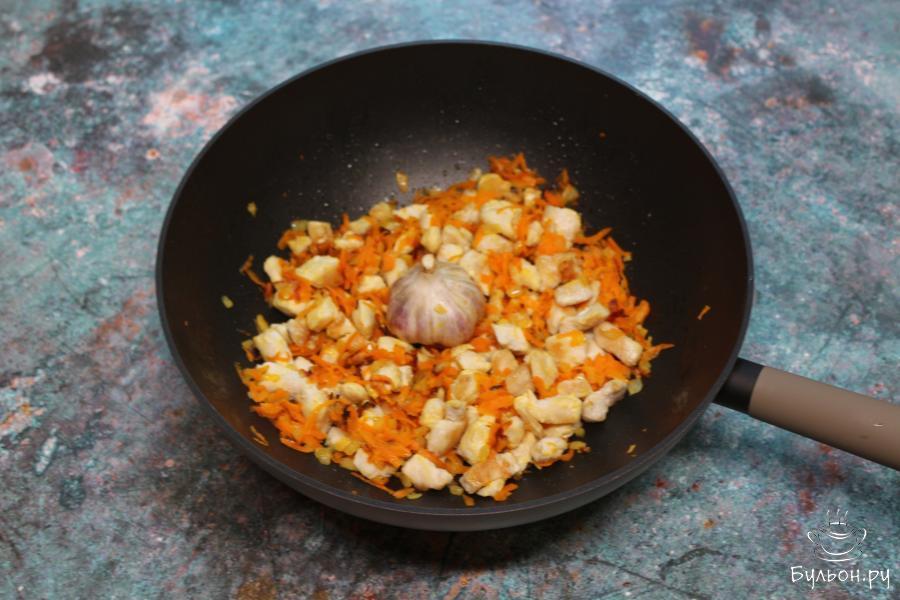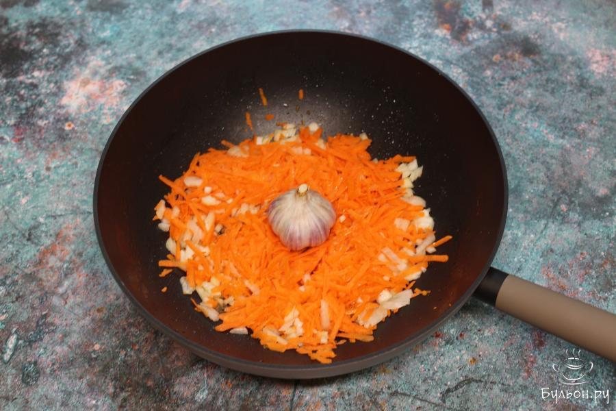 3. Дале, обжаренное мясо убрать со сковороды, а в нее выложить морковь, лук и головку чеснока. Жарить до мягкости овощей, периодически помешивая.