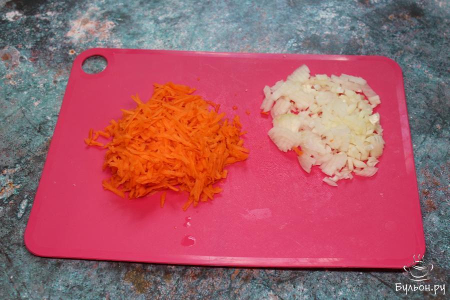 2. В это время почистить овощи, после чего лук нарезать мелкими кубиками, а морковь натереть на крупной терке.