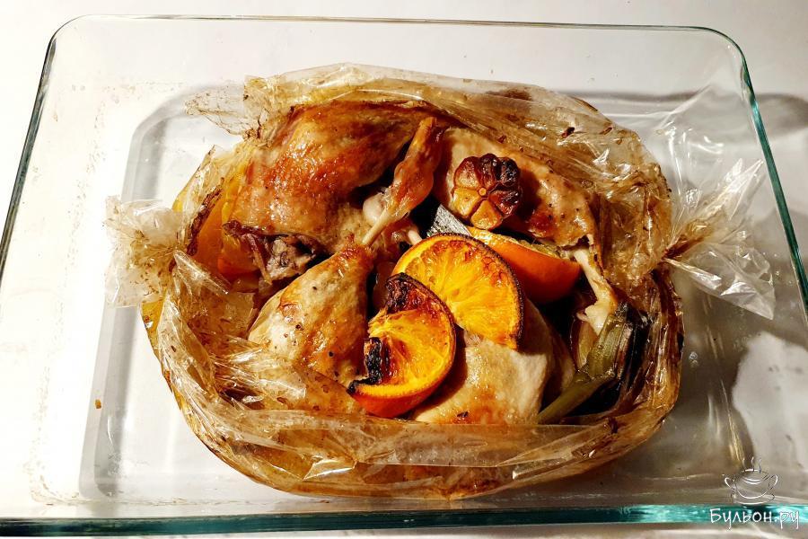 1. Подготовить рукав для запекания, если нужно, завязать с одной стороны. Окорочка и фрукты промыть, обсушить. Яблоко и апельсин порезать крупными дольками, головку чеснока - пополам, зелень лука порея - крупными кусками.