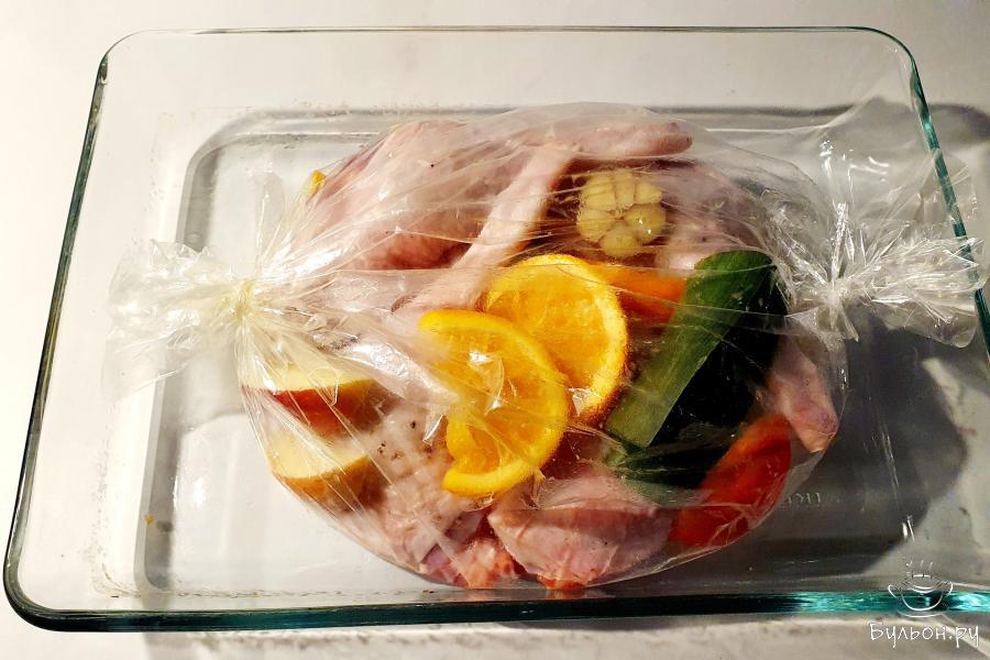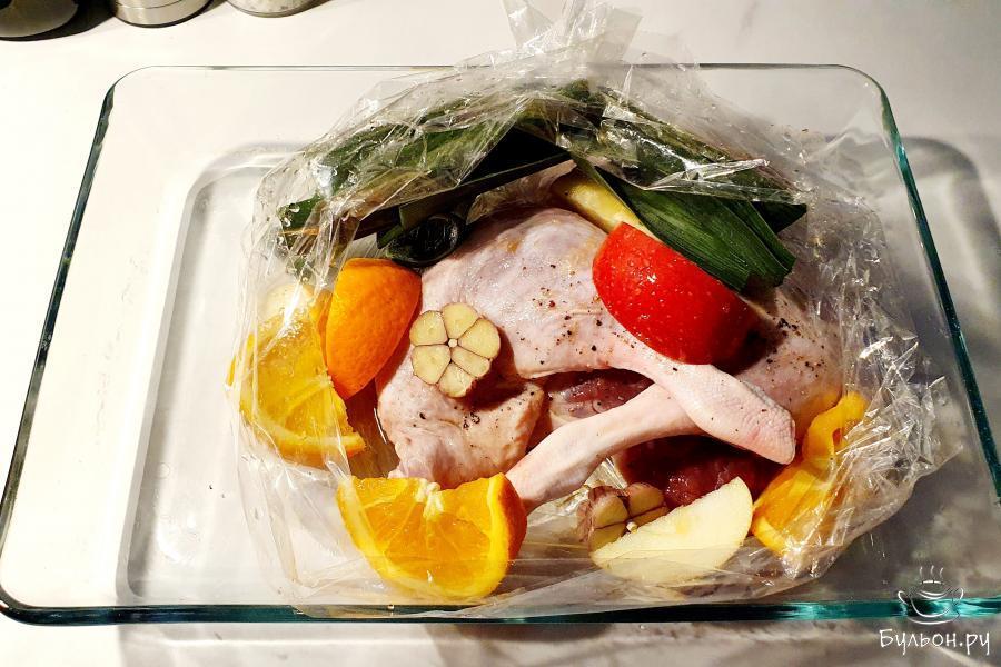 2. Уложить в рукав утиные окорочка, апельсин, яблоко, перья лука-порея, чеснок, полить маслом, посолить, поперчить. Завязать рукав, встряхнуть, чтобы все смешалось.