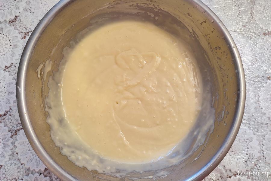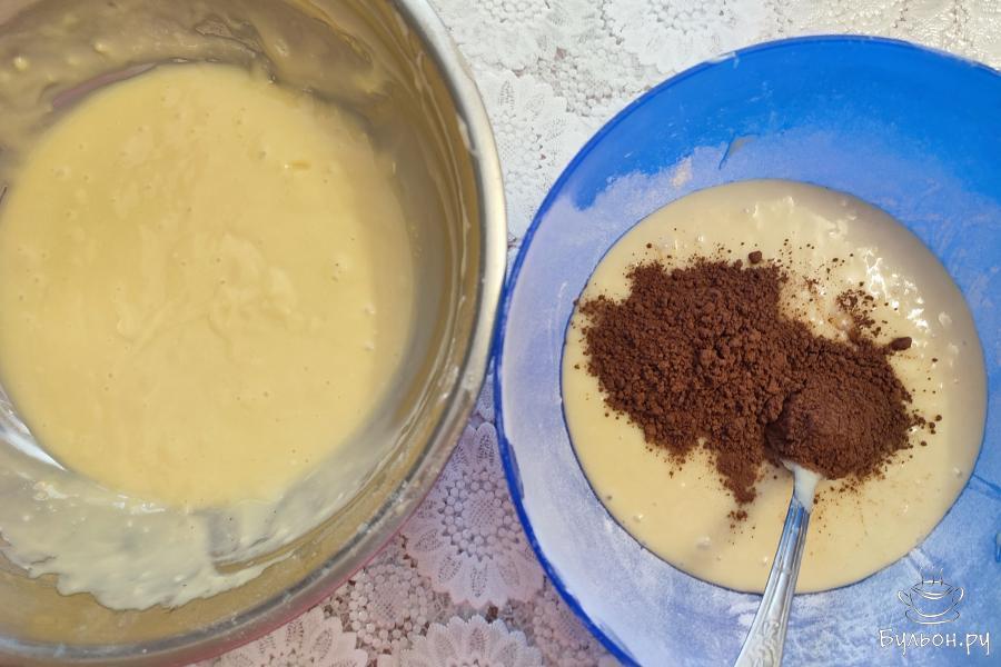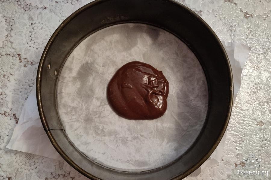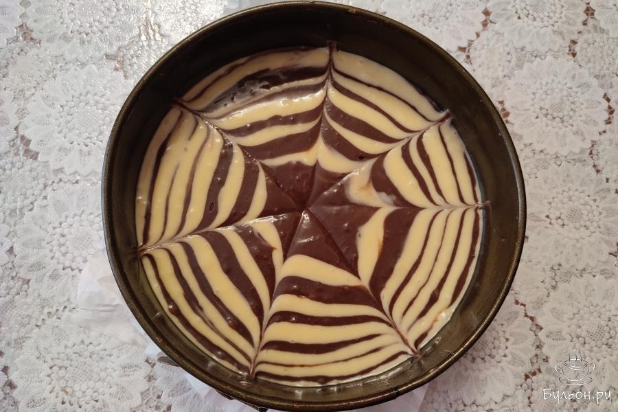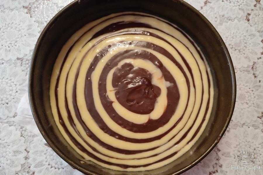 7. Затем положить в середину теста еще 2 ложки другого теста. Таким образом, чередуя цвета, заполнить форму тестом.