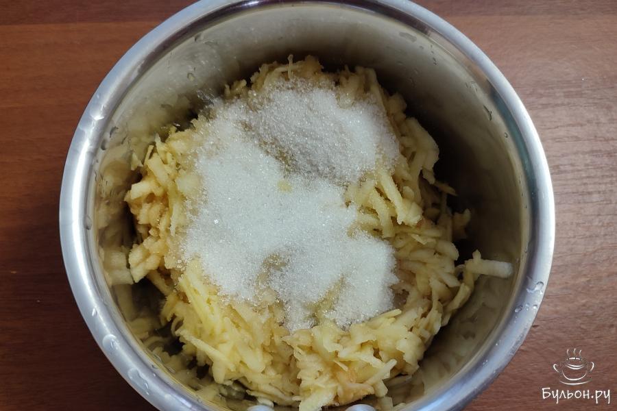 5. Далее надо приготовить яблочную начинку. Яблоки почистить, потереть на терке. Соединить с оставшимся сахаром. Потушить несколько минут до появления сока.