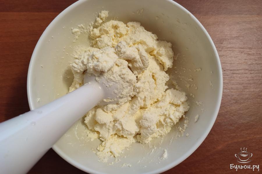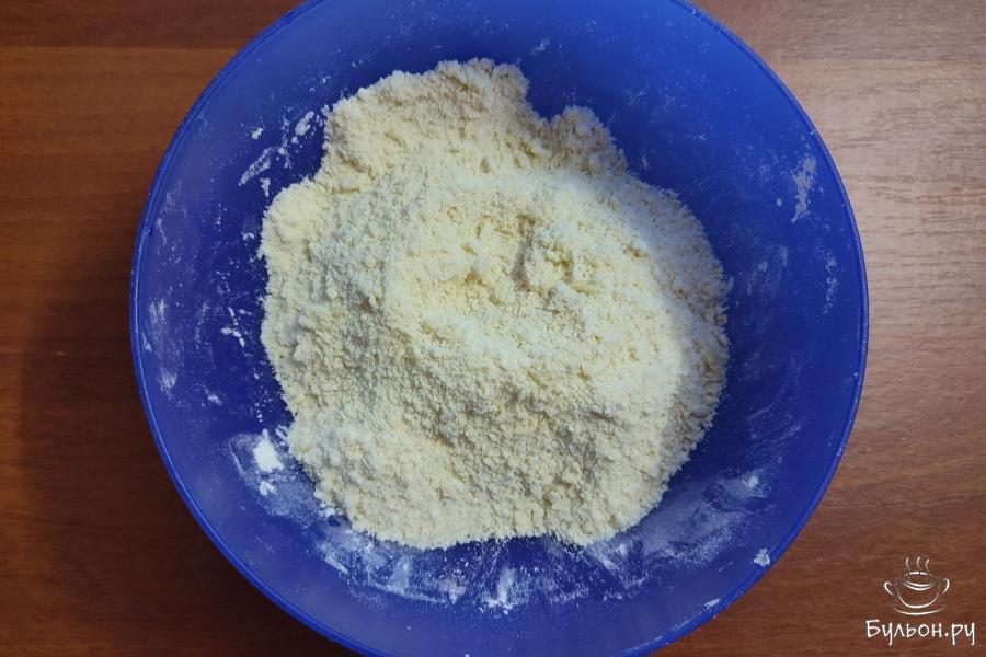 3. Затем надо приготовить тесто: 200 г муки растереть руками с размягченным сливочным маслом, с 3 ст. л. сахара, разрыхлителем и с 0.5 г ванилина. Должна получиться крошка.