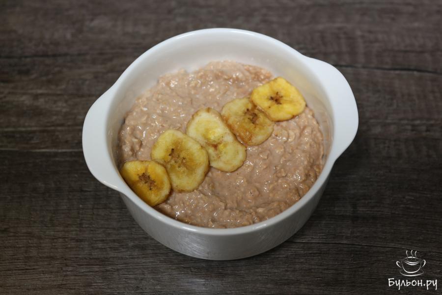 7. На утро достать кашу из холодильника. По желанию, украсить или добавить дополнительные продукты. Я добавила в кашу банановые чипсы, но можно добавить и кусочки обычного банана, если не любите хрустящие. Каша готова.