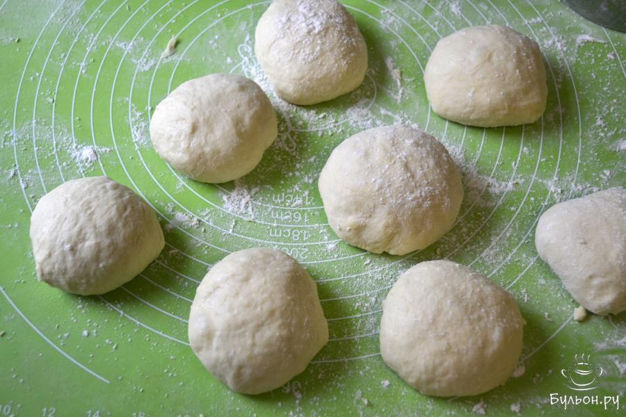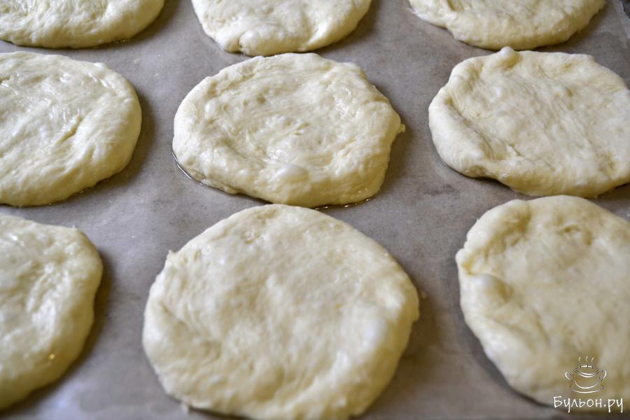 7. Застелить противень пекарской бумагой или силиконовым ковриком. Каждый шарик теста раскатать в лепешку, толщиной около 1 см. и уложить на противень.