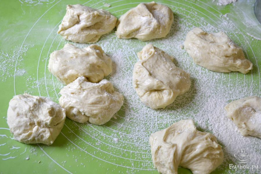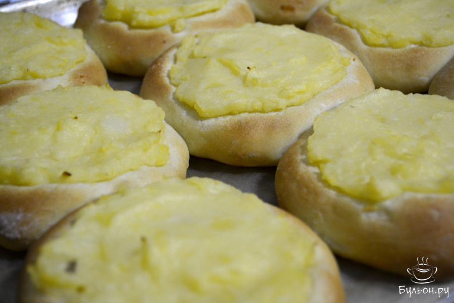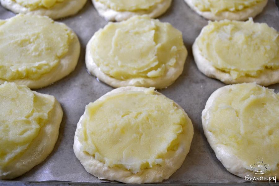 8. На каждую лепешку положить порцию картофельного пюре и накрыть противень чистым полотенцем, для расстойки, на 20-25 минут.