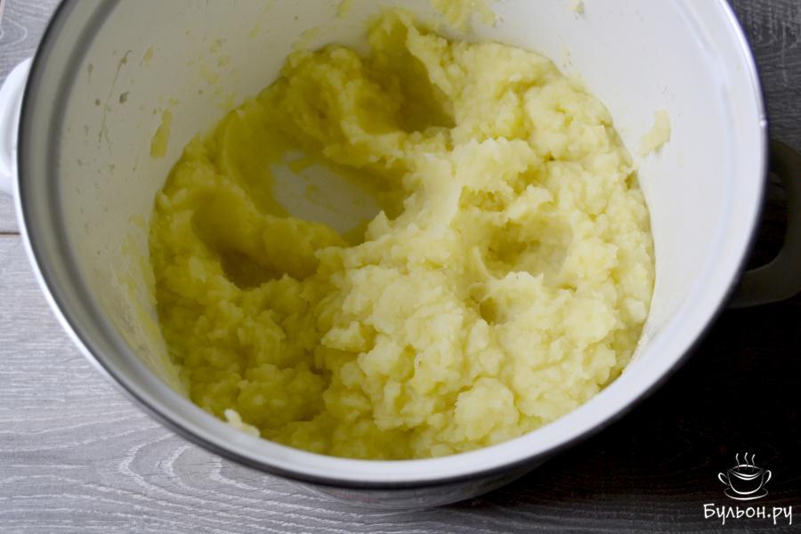 4. Продолжить толочь пюре с молоком до однородного состояния. Затем добавить сливочное масло (немного оставить для смазки шанег) и еще раз истолочь пюре. Пюре должно получиться однородное, гладкое, без комочков, не густое.