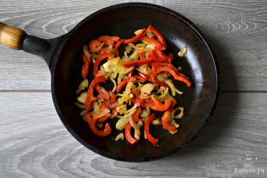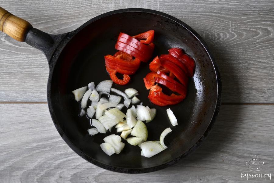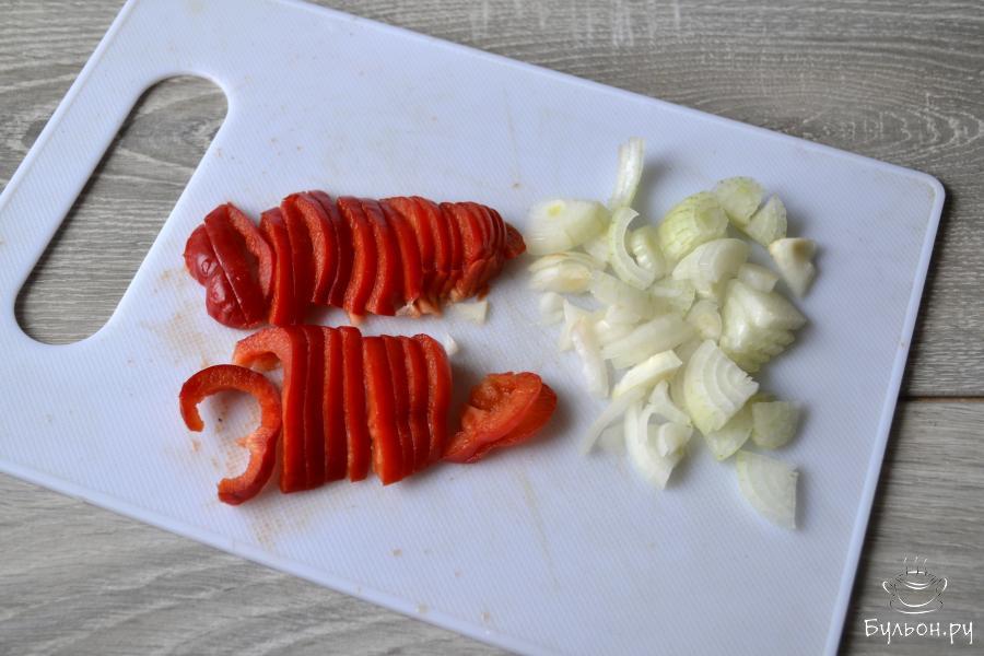 1. Лук очистить и нарезать его полукольцами. Сладкий перец вымыть, разрезать на две части, удалить семена и нарезать тонкой соломкой.