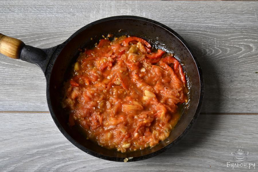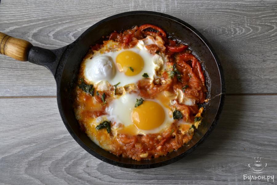 7. Продолжить готовить на огне, ниже среднего, до готовности яиц. В шакшуке белок должен хорошо "схватиться", а желток должен остаться немного жидким.