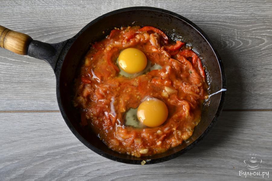 6. Примерно через 7-8 минут, когда жидкость немного выпарится, ложкой сдвинуть в сторону томатную массу и разбить туда яйца. Яйца посолить. По желанию, посыпать свежей или сушеной зеленью.