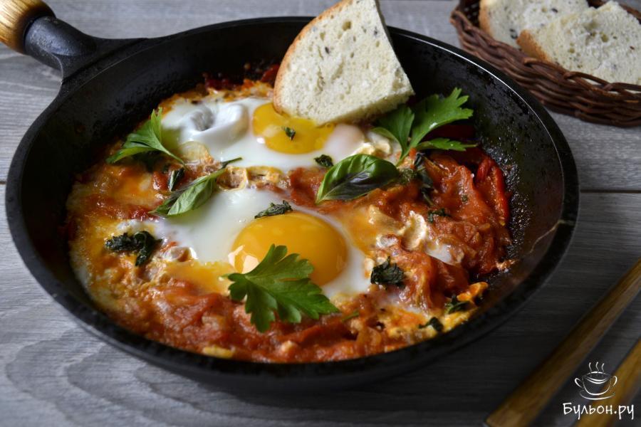 8. Как правило, шашкушу подают на стол в той же посуде, в которой готовили. Жидкий желток вымакивают хлебом. Приятного аппетита!