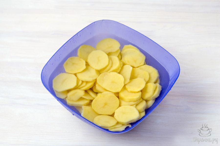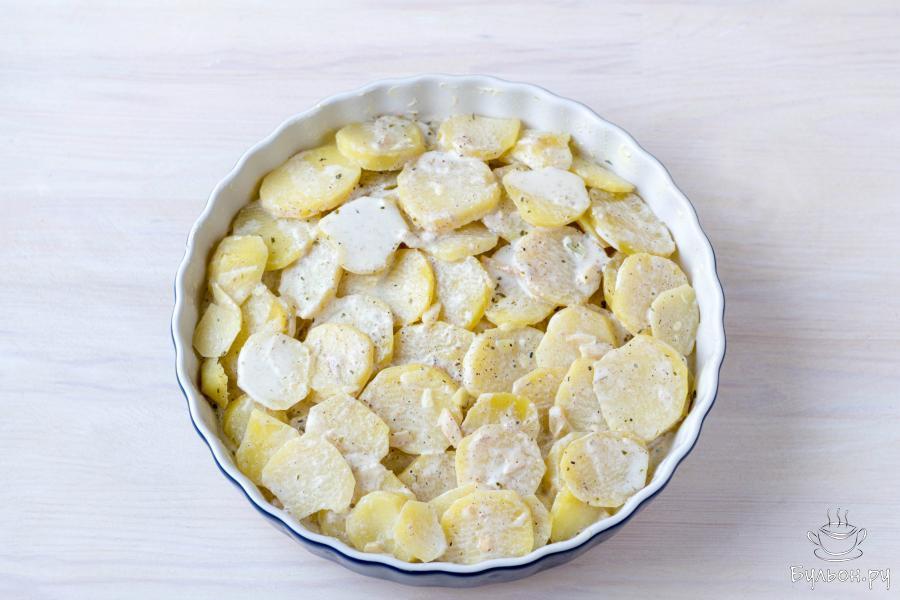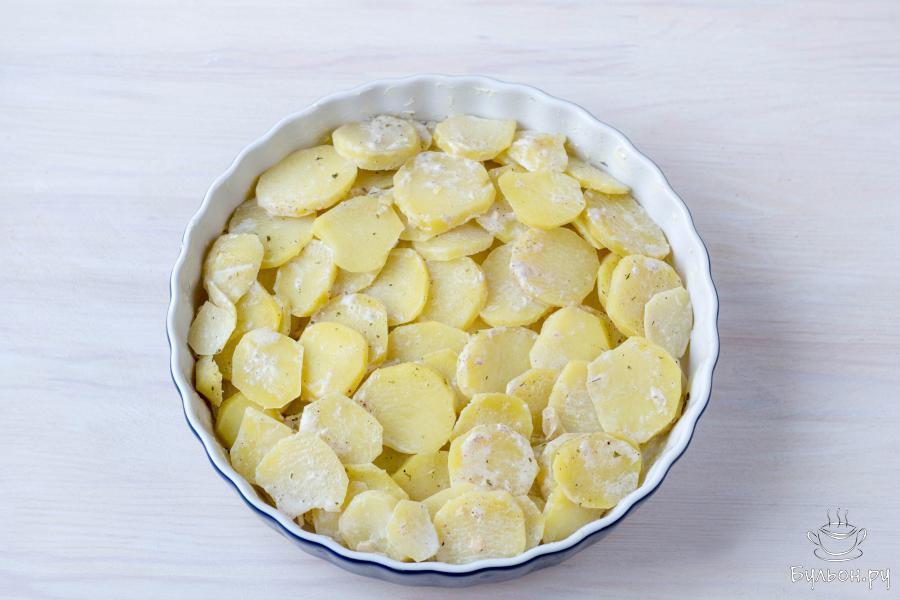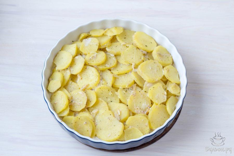 7. Выложите картофель в форму слоями. Добавьте 1-2 щепотки соли и, по желанию, немного молотого черного перца.