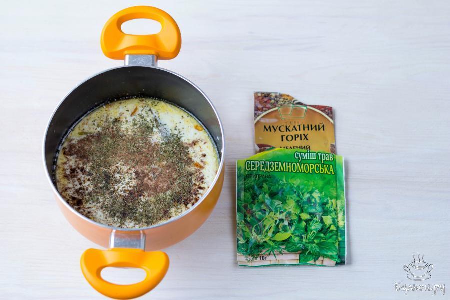 4. Добавьте 1-2 щепотки соли, молотый мускатный орех и сушеные травы по вкусу. Доведите смесь до кипения.