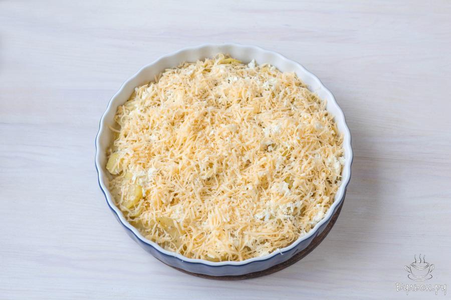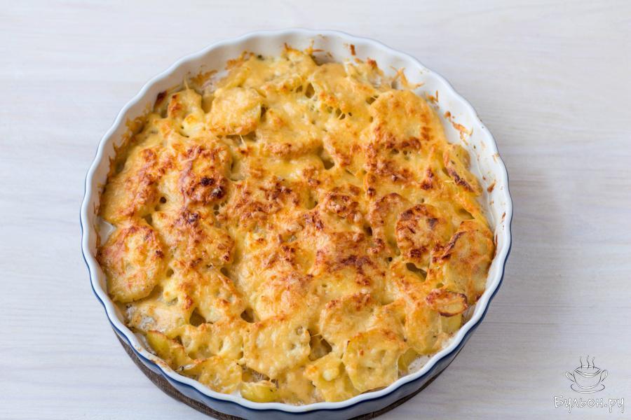 11. Поместите блюдо в верхнюю треть духовки, увеличьте температуру до 200-220 градусов или включите режим "гриль" и готовьте картофель еще 10-12 минут, пока сыр не подрумянится.