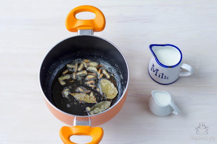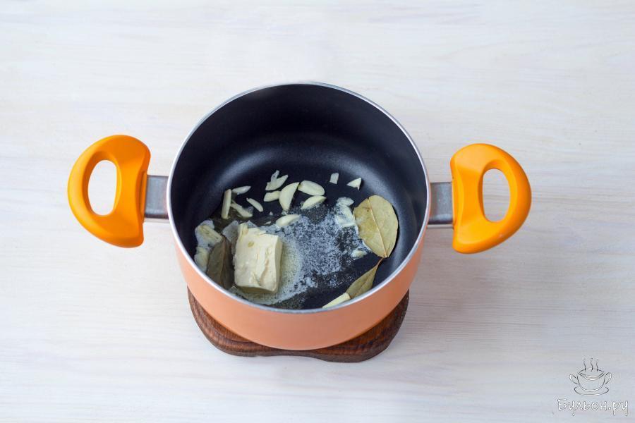 2. На небольшом огне растопите 1 столовую ложку сливочного масла. Добавьте 2 мелко нарезанных зубчика чеснока и 2-3 лавровых листа и помешивая, обжарьте чеснок 2-3 минуты.