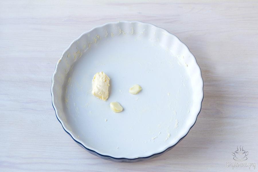 6. Разрежьте зубчик чеснока пополам и натрите борта и дно формы для запекания. Смажьте форму сливочным маслом.