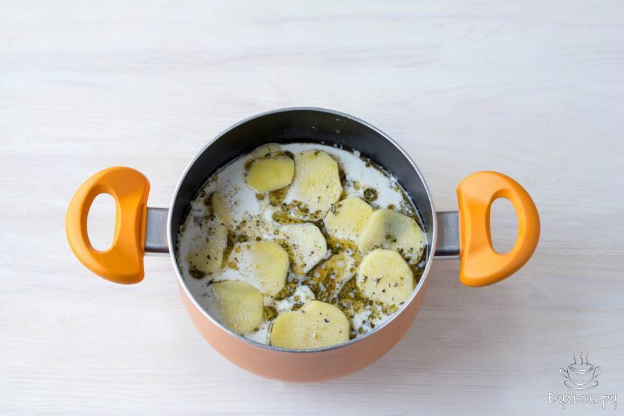 5. В кипящую молочную смесь добавьте часть подготовленного картофеля. Снова доведите смесь до кипения и варите картофель 5-7 минут, до полуготовности. Затем извлеките ломтики картофеля и повторите процедуру с оставшимся картофелем.
