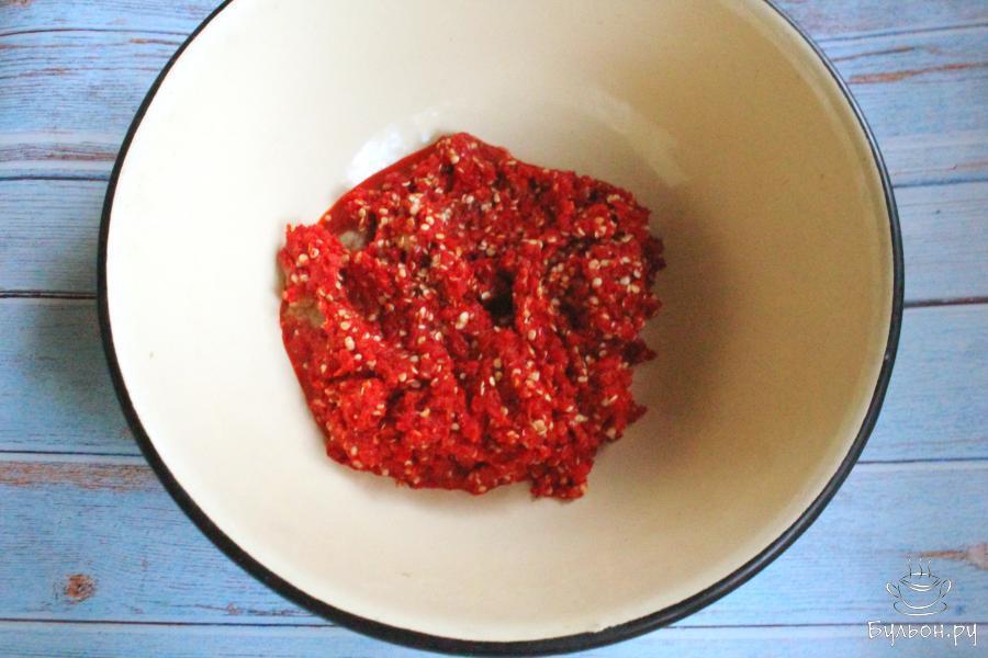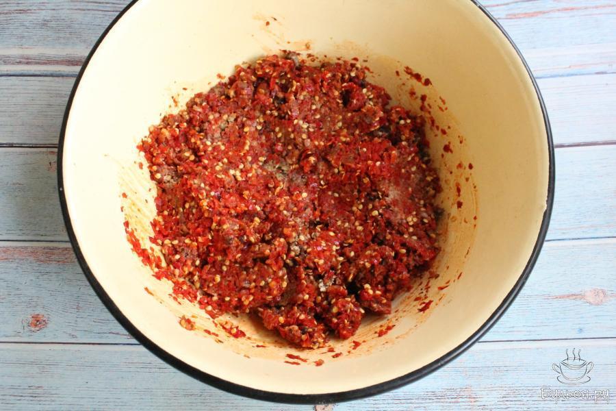 9. Перемешать аджику и оставить ее при комнатной температуре на три дня. Периодически аджику надо перемешивать, чтоб соль растворилась.