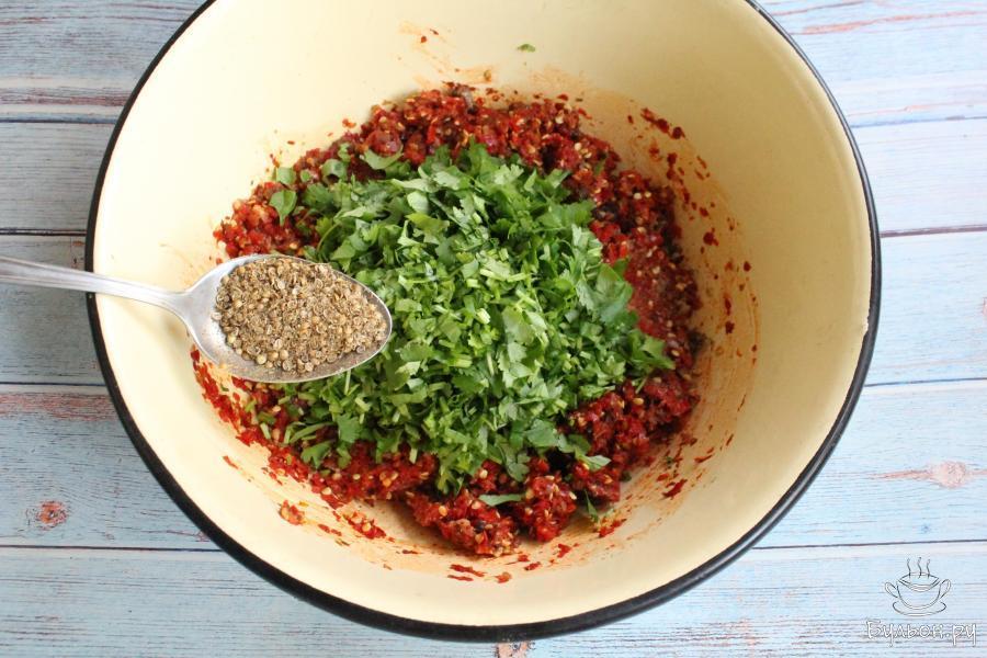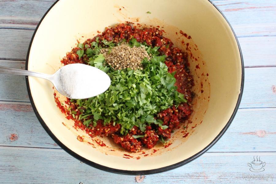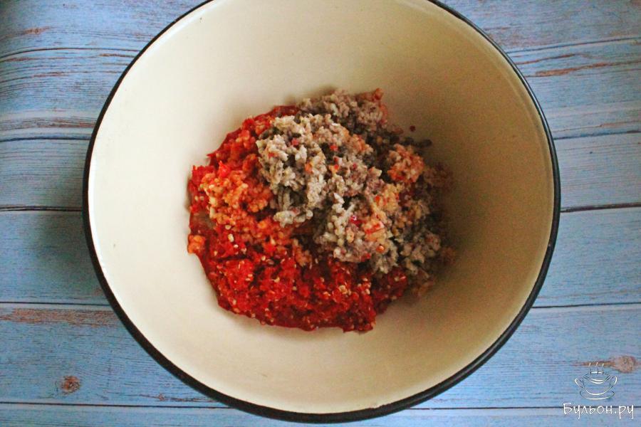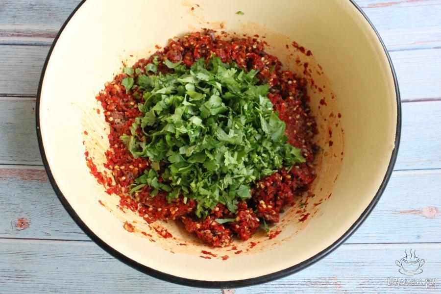 Острая аджика по-грузински порадует любителей острых закусок и соусов, эта аджика действительно получается очень острая, пряная и жгучая. Такую аджику можно подать как самостоятельную закуску и можно использовать для обмазывания птицы и мяса при запекании или обжаривании. Для приготовления такой аджики можно использовать и другую ароматную зелень, например добавить базилик и немного петрушки. Если вы хотите более однородную консистенцию аджики, то ее нужно пропустить через мясорубку два-три раза.
