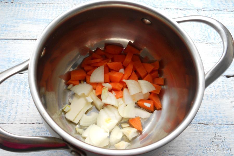 2. В кастрюлю влить растительное масло, добавить порезанные кусочками овощи: лук и морковь. Обжарить на небольшом огне около 3-4 минут.