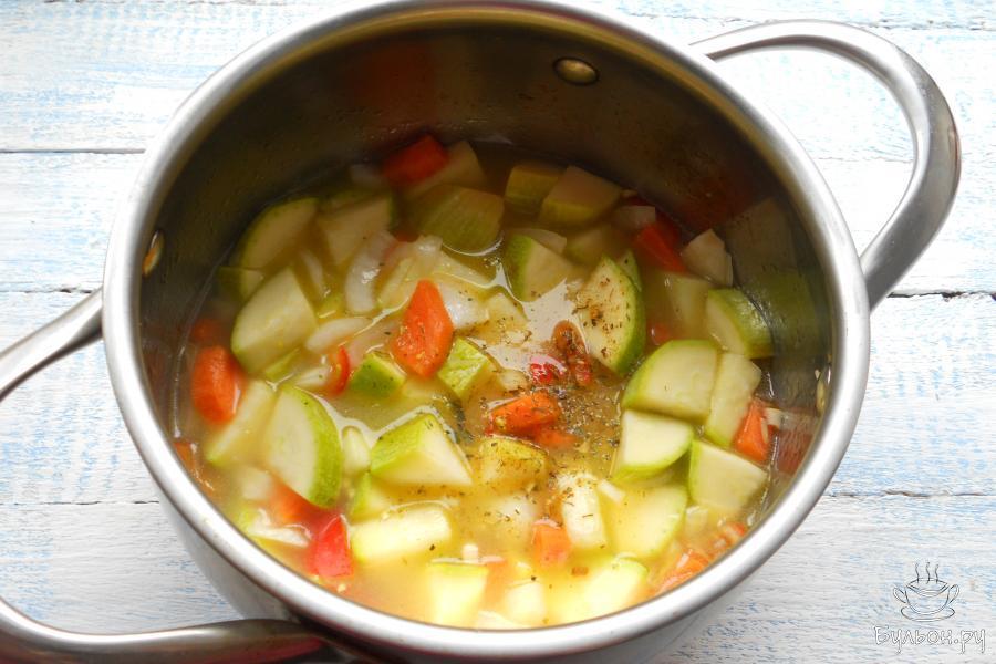 4. Далее влить горячую воду, вода должна только немного покрывать овощи, всыпать соль по вкусу, приправу и варить их на слабом огне около 30 минут.