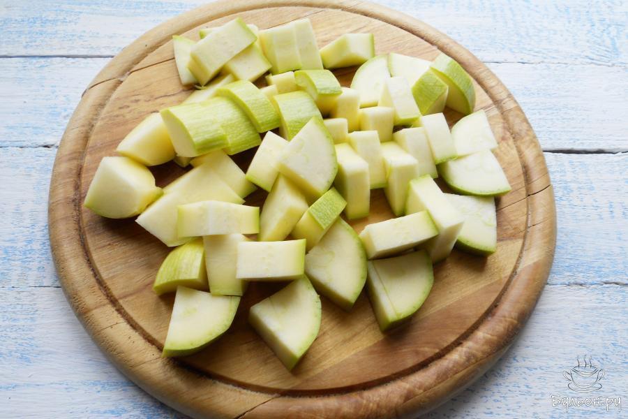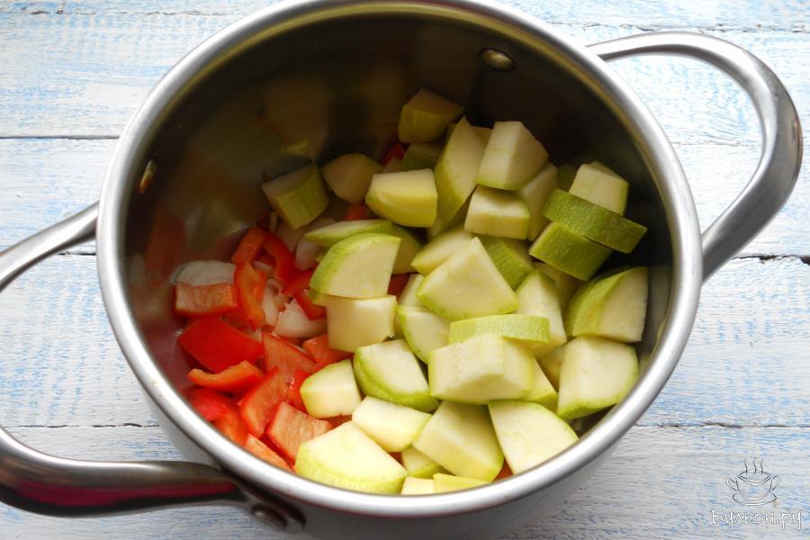 3. Добавить в кастрюлю подготовленный кабачок и порезанный соломкой или кусочками сладкий болгарский перец Все перемешать и обжаривать еще минуты 4.