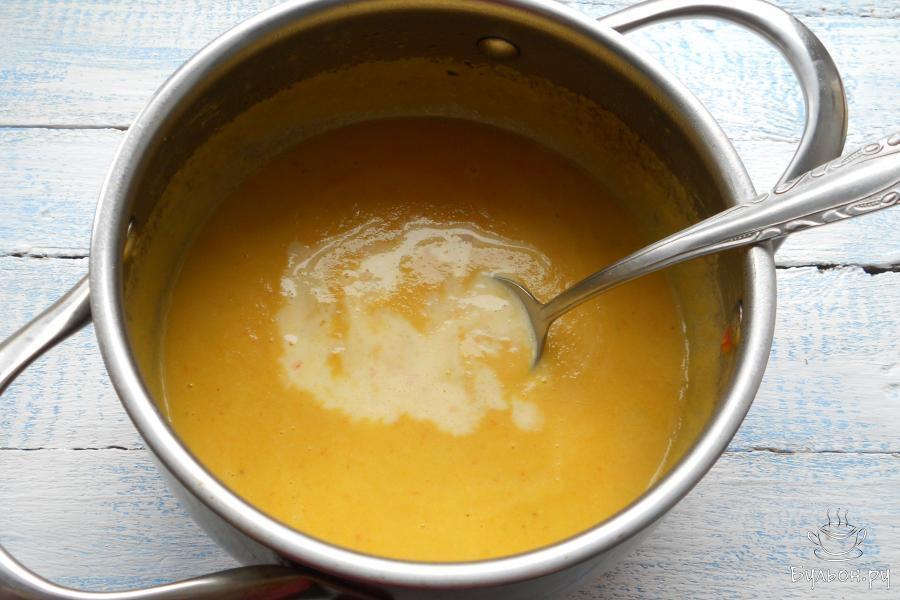 6. Сливки подогреть и влить в суп, перемешать. Довести суп на небольшом огне, помешивая, до кипения и выключить газ.
