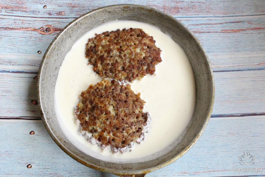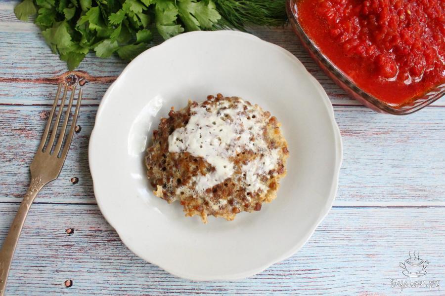 9. Вылить сметану на сковороду, где обжаривались котлеты. В сметану выложить гречаники. Тушить гречаники в соусе 15 минут.