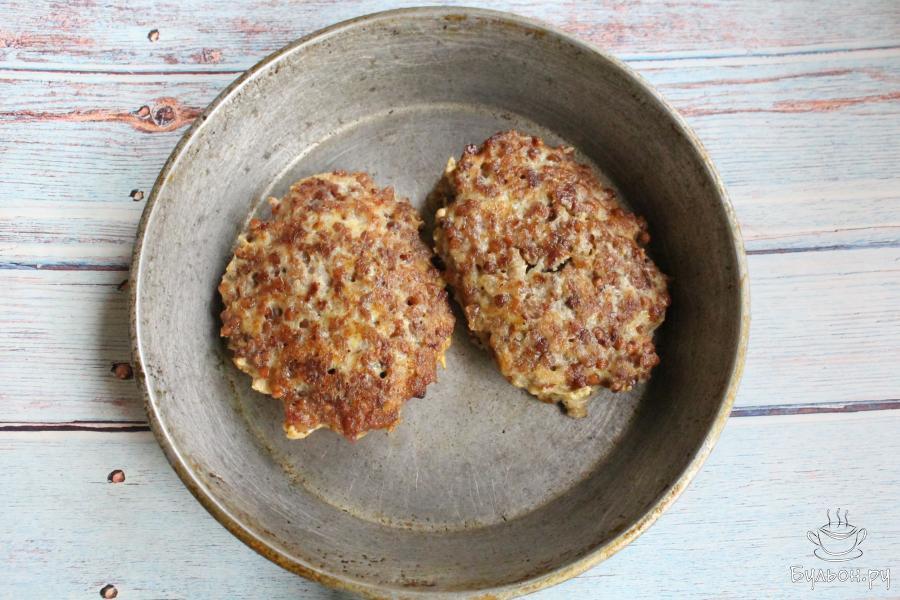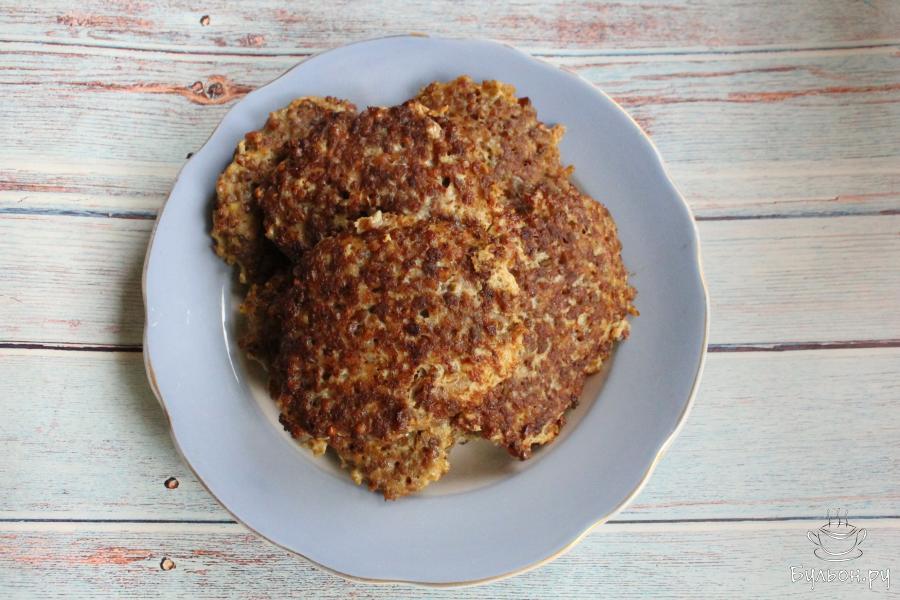6. Столовой ложкой выложить котлеты в сковороду с разогретым маслом. Обжарить гречаники по 2-3 минуты с каждой стороны.
