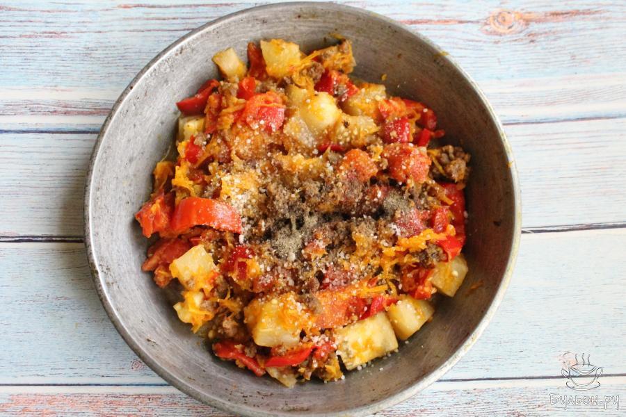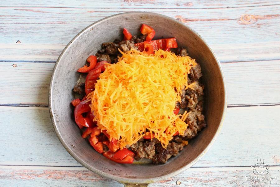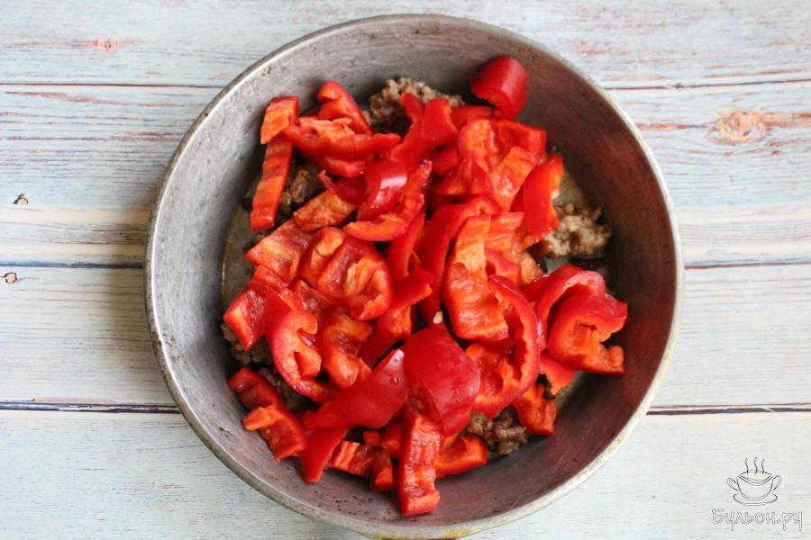 2. Красные болгарские перцы промыть, почистить от семечек и нарезать не очень тонкими полосками. Добавить перцы к фаршу, жарить все вместе 2-3 минуты.