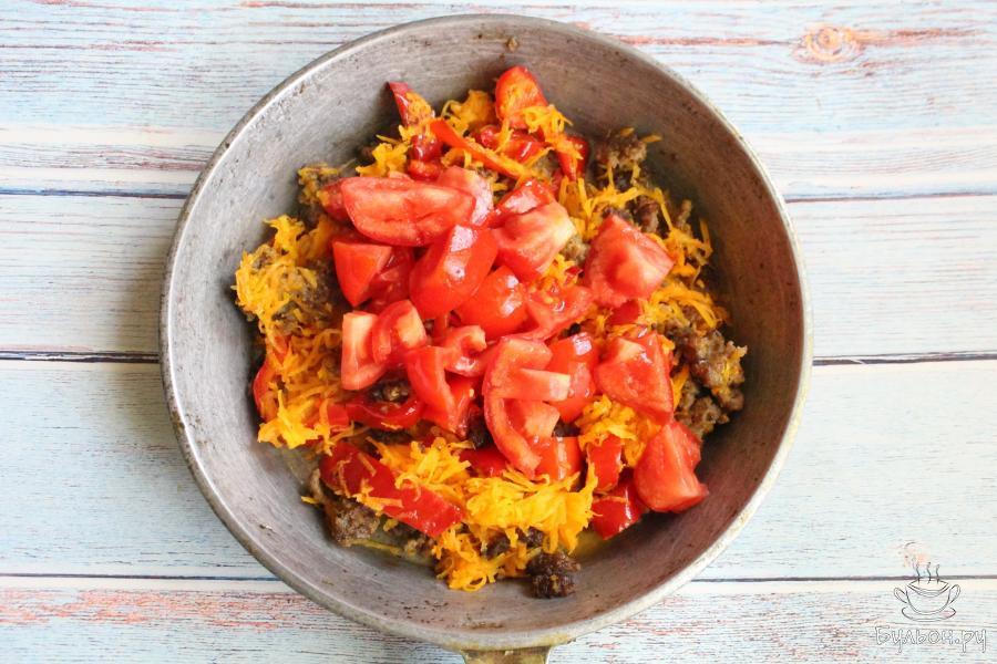 4. Помидоры промыть, нарезать не очень мелко. Сразу добавить помидоры на сковороду. Тушить все вместе 5 минут.