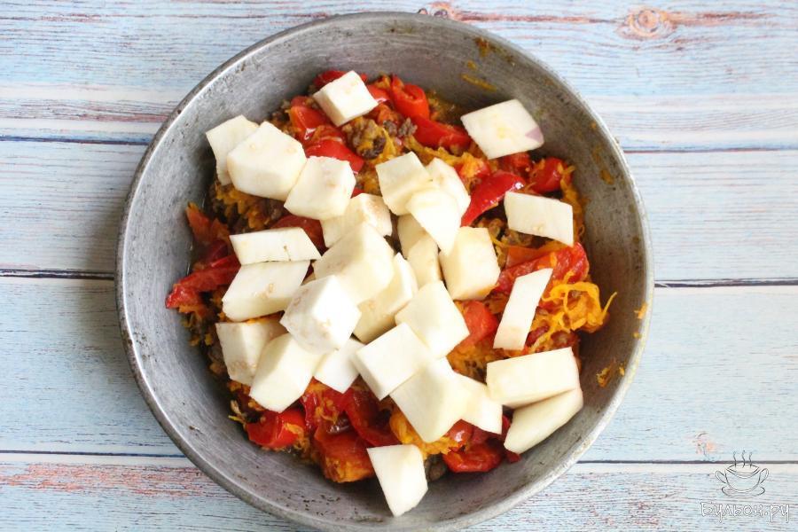 5. Баклажаны промыть, почистить, нарезать крупными кубиками. Добавить баклажаны на сковороду, тушить 10 минут, помешивать.