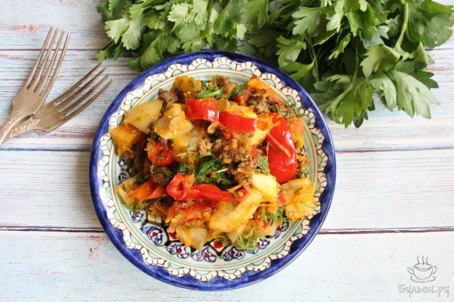 Овощи с фаршем на сковороде порадуют вас своим насыщенным вкусом и ярким цветом. Такие овощи можно подать к столу как самостоятельное блюдо или с любым любимым гарниром. Готовится такое блюдо быстро, на скорую руку. Зелень для приготовления можно брать ту, которую любит ваша семья. Овощи получаются легкие, сочные, пропитанные, невероятно ароматные и аппетитные. Попробуйте приготовить такое блюдо к обеду или ужину, оно вам наверняка понравится.