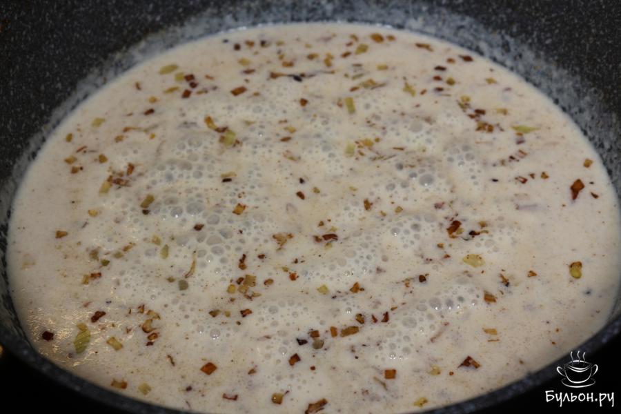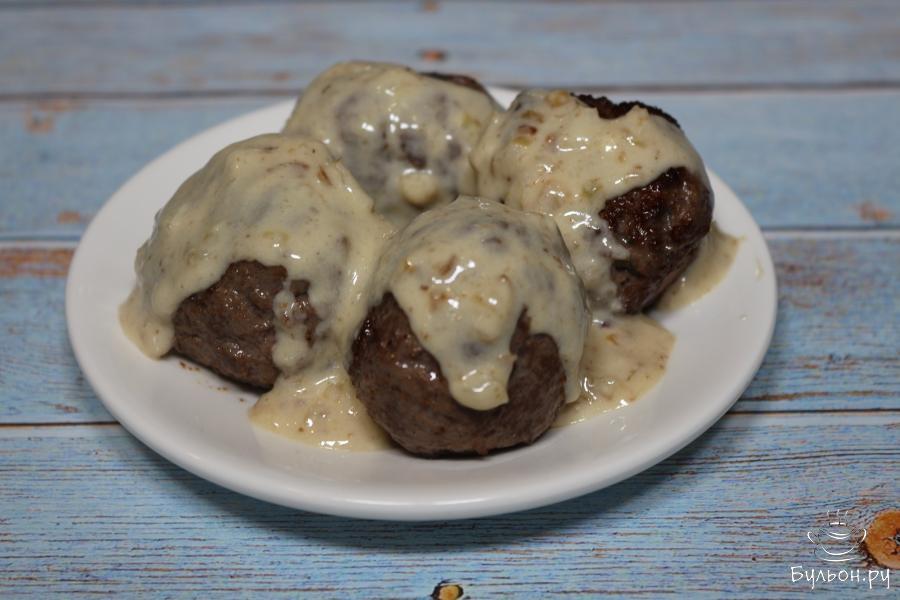 5. Убрать со сковородки митболы и влить молоко с крахмалом, добавить ранее жаренный лук, посолить. Продолжить готовить соус до загустевания, постоянно помешивая его.
