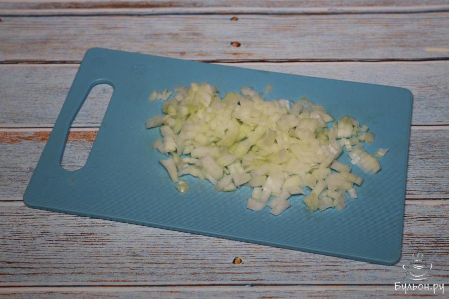 2. Лук очистить, молко нарезать и поджарить на сковороде с растительным маслом, до золотистого цвета. Убрать лук в мисочку.