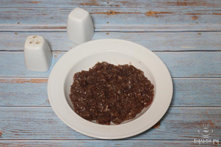 1. Нужно приготовить фарш. Кусок говядины нарезать на кусочки и пропустить через мясорубку, добавить соль и черный молотый перец, хорошо перемешать.