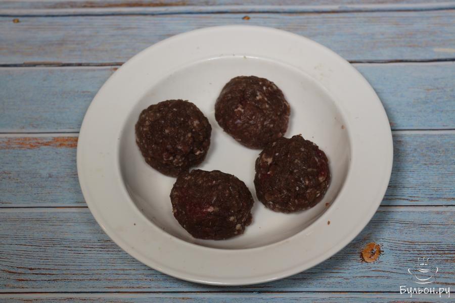 3. В это время сформировать будущие митболы. Нужно просто поделить фарш на 4 части и скатать щарики. Прожарить их на той же сковороде, где жарился лук, со всех сторон.