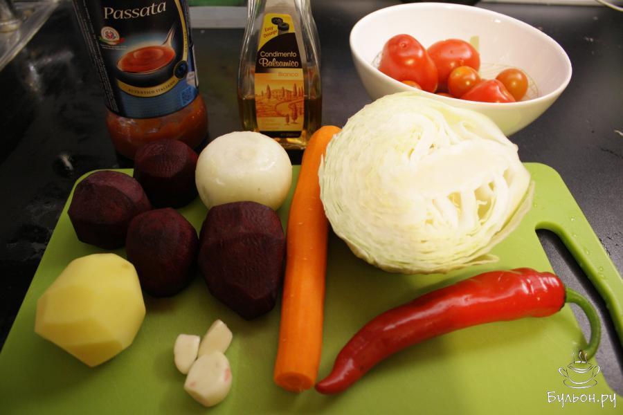3. Овощи промыть, очистить. Свеклу порезать тонкими брусочками, картофель порезать кубиками, капусту мелко нашинковать. Длина ингредиентов в супе не должна превышать ширины ложки.
