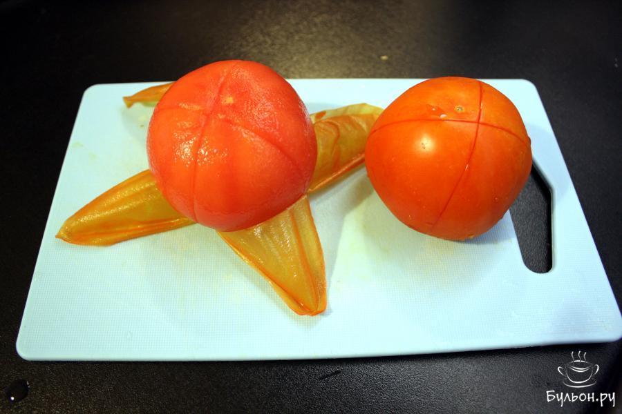 6. С помидора снять шкурку. Для этого сделать надрез крест-накрест, залить кипятком на 2 минуты, после этого опустить в холодную воду, чтоб остановить процесс варки. Удалить семена, порезать кубиками.