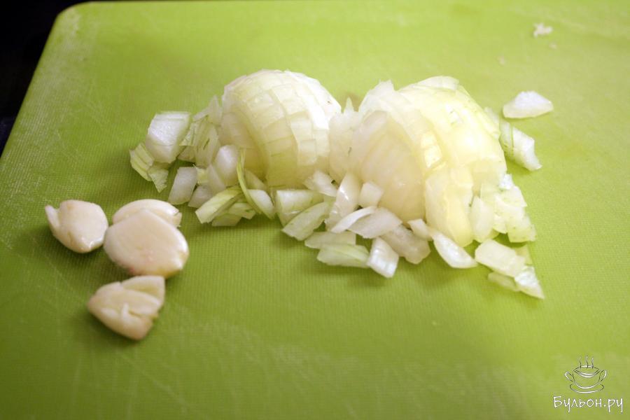 7. В сотейник налить масло, разогреть. Обжарить чеснок до аромата и лук. Добавить морковь, долить немного бульона. Тушить под крышкой 5 минут.