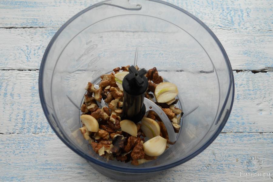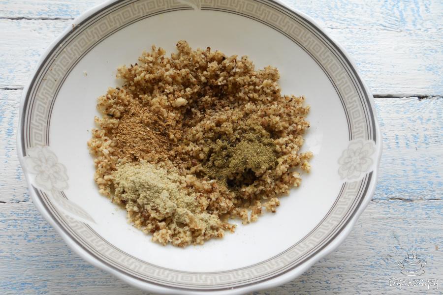 6. Переложить орехово-чесночную смесь в миску, добавить кориандр, уцхо-сунели, хмели-сунели и немного соли.