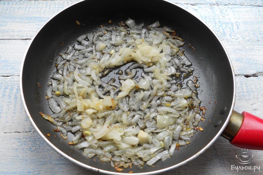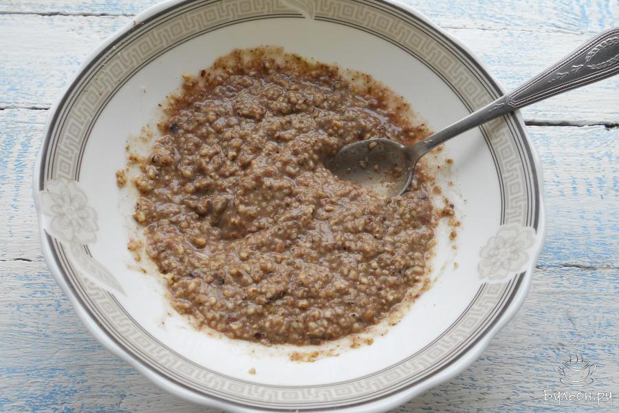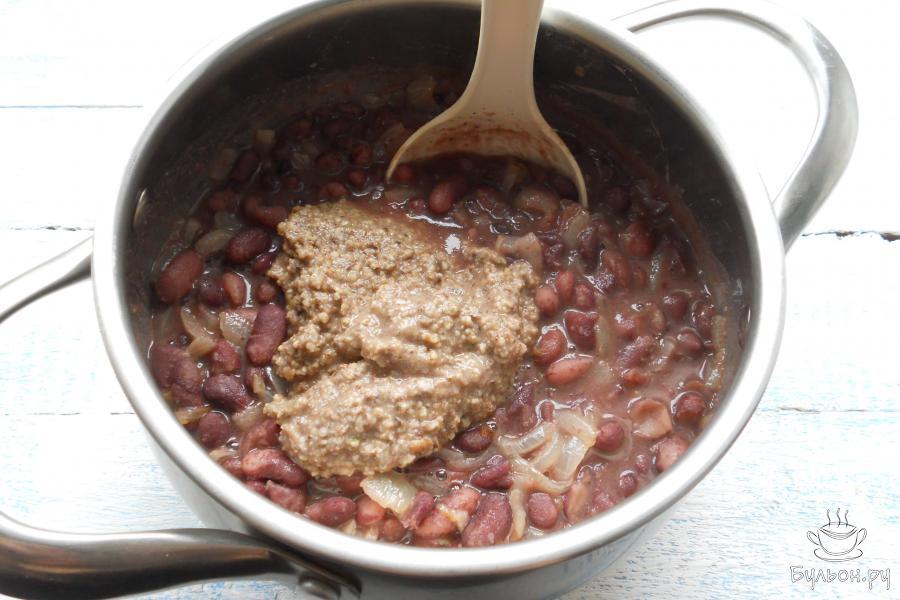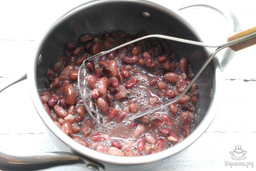 2. Отварить фасоль до готовности, добавив в воду половину порезанной луковицы. У меня фасоль варилась около 1 часа. Разные сорта фасоли варятся различное время, пробуйте. Готовую фасоль немного размять толкушкой, не сливая воду.