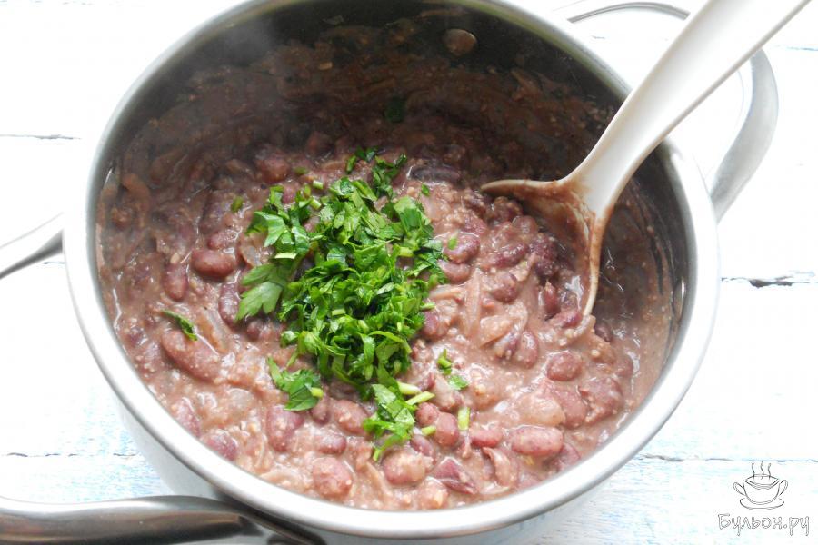 10. Добавить измельченную зелень петрушки или, по-желанию, кинзы, посолить все по-вкусу, поперчить молотым перцем чили, влить винный уксус. Лобио перемешать, прогреть еще около 5 минут и выключить газ.